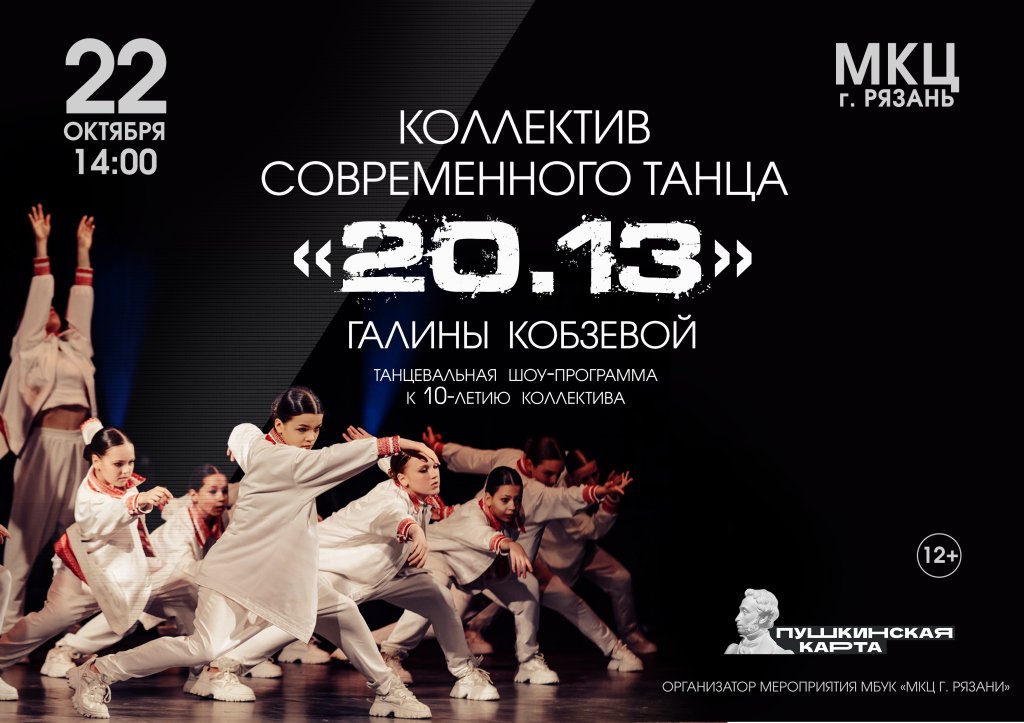 Юбилейная программа коллектива «20.13» студии танца Галины Кобзевой представит зрителю лучшие постановки за прошедшие десять лет. Это работы, удостоенные высоких оценок жюри на престижных международных и всероссийских фестивалях.